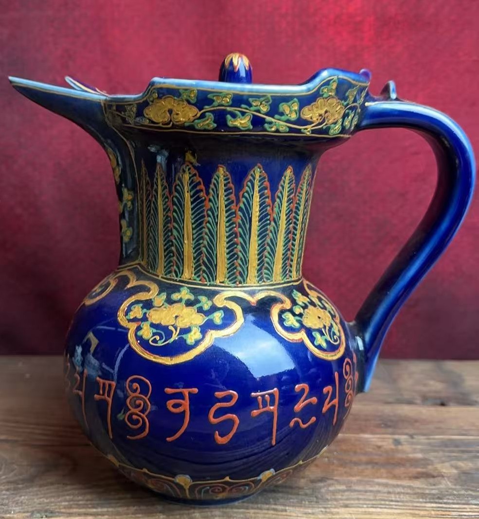 名称:明永乐霁蓝釉沥粉戗金花卉纹僧帽壶