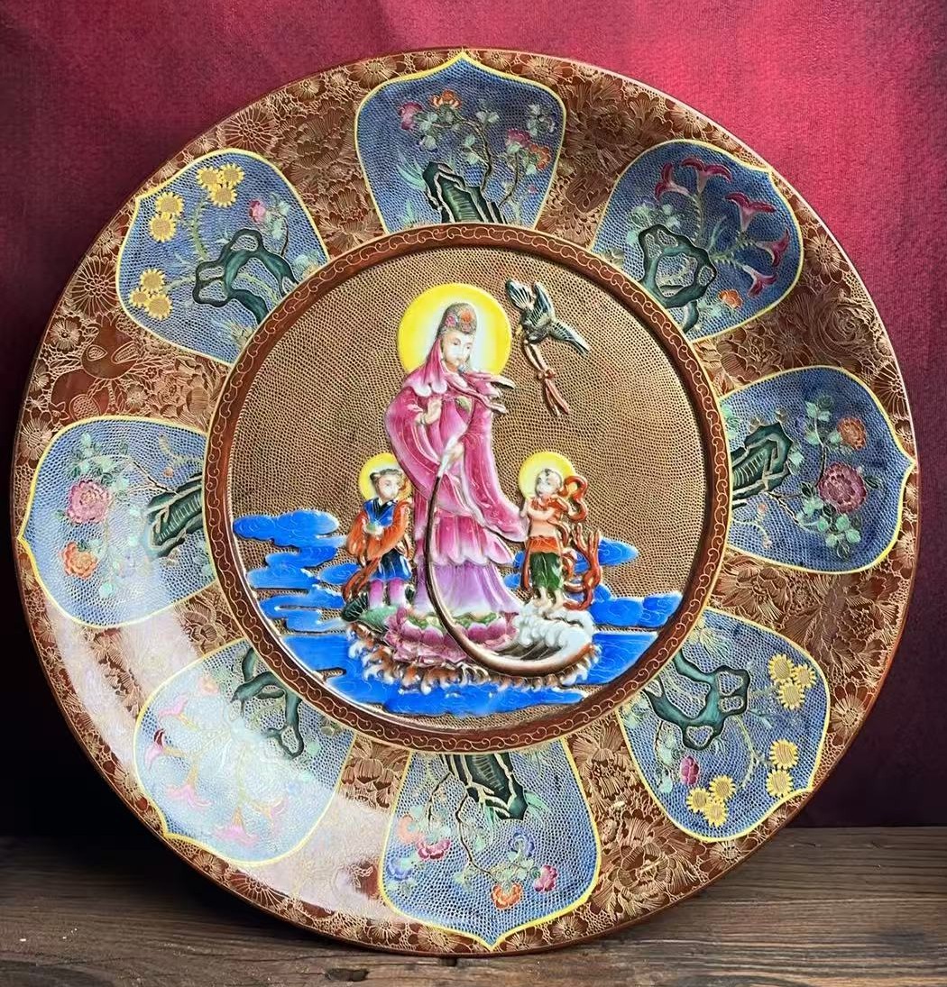 清乾隆掐丝珐琅开窗送子观音图大盘