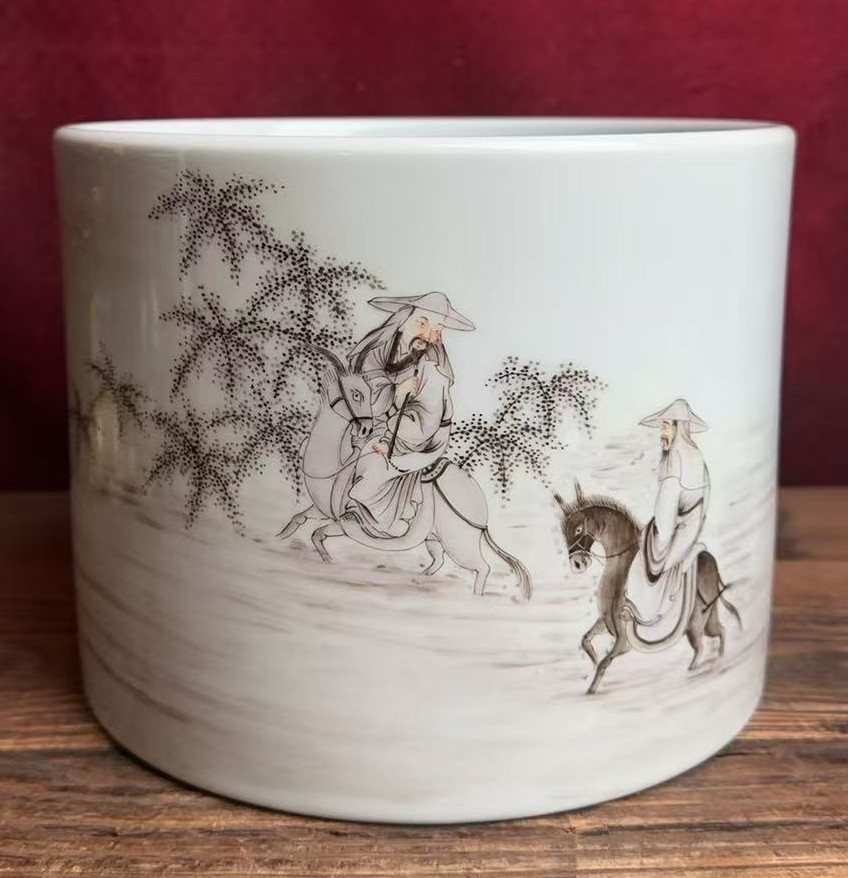 清雍正墨彩杜甫游春图笔筒