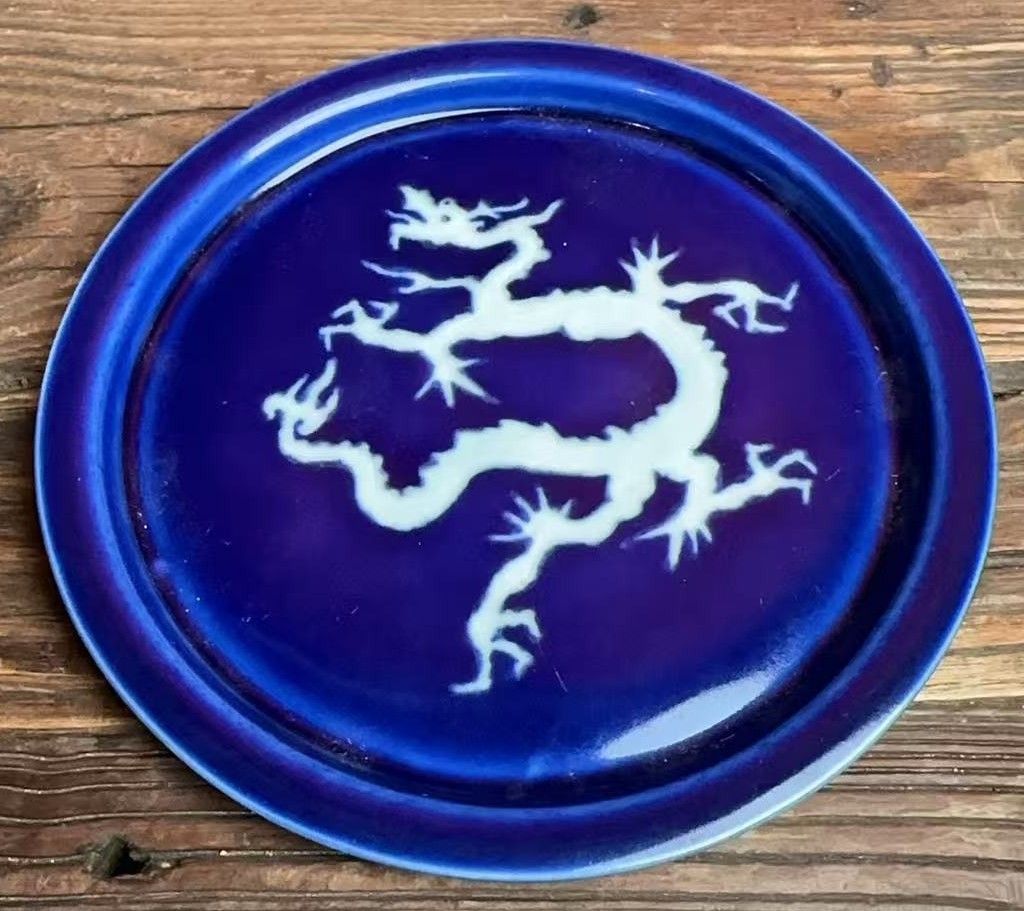 名称:元霁蓝留白龙纹折沿盘