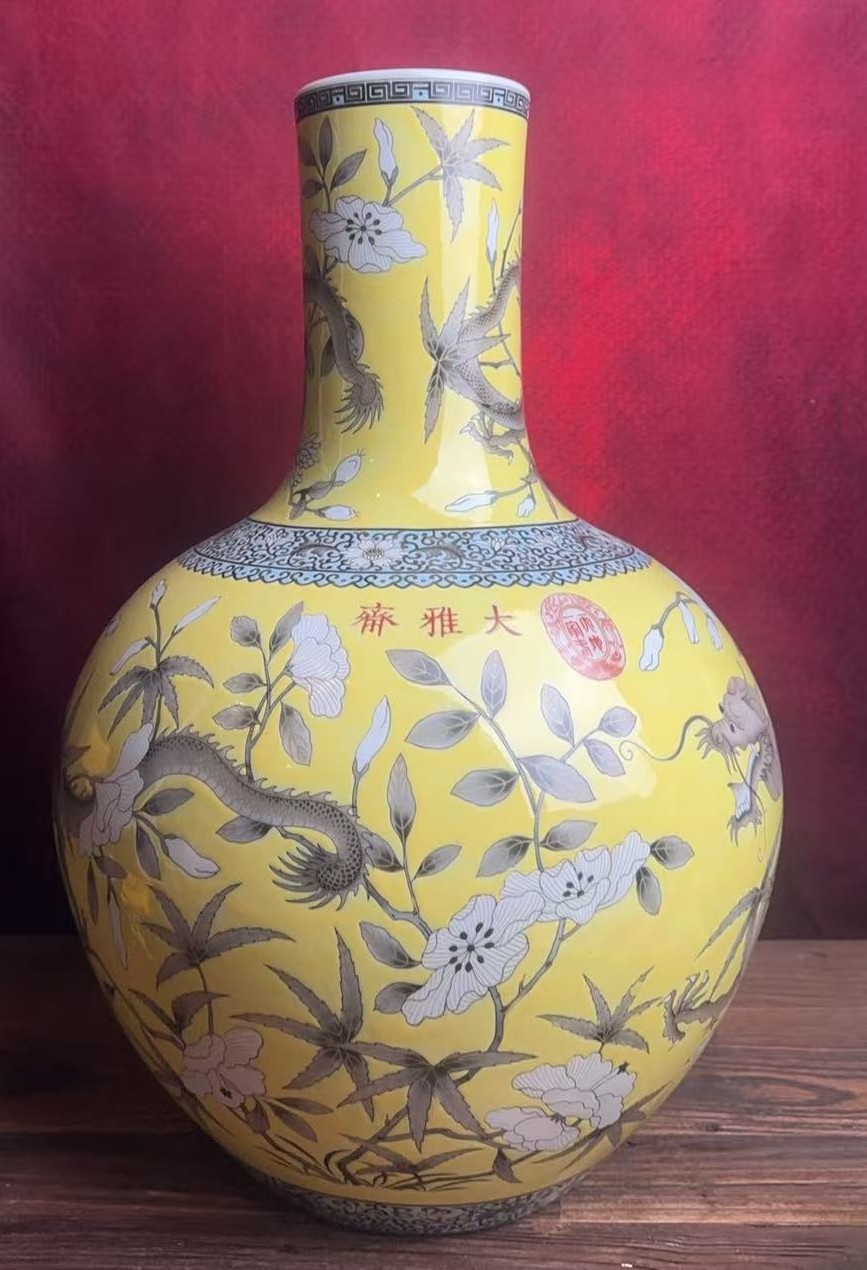 名称:清大雅斋黄地墨彩穿花龙纹天球瓶