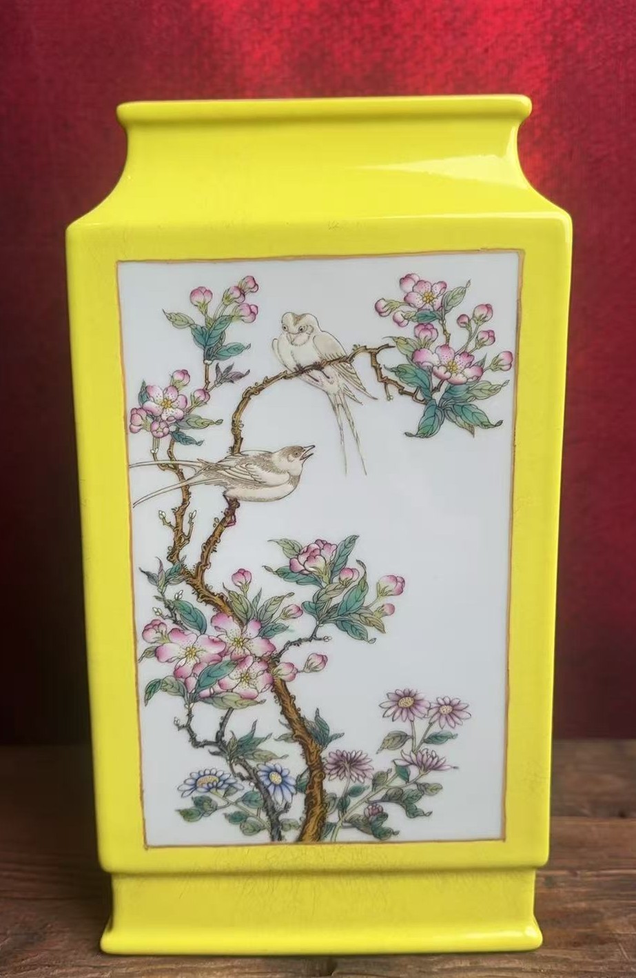 名称:清乾隆黄地粉彩花鸟纹四方扁瓶
