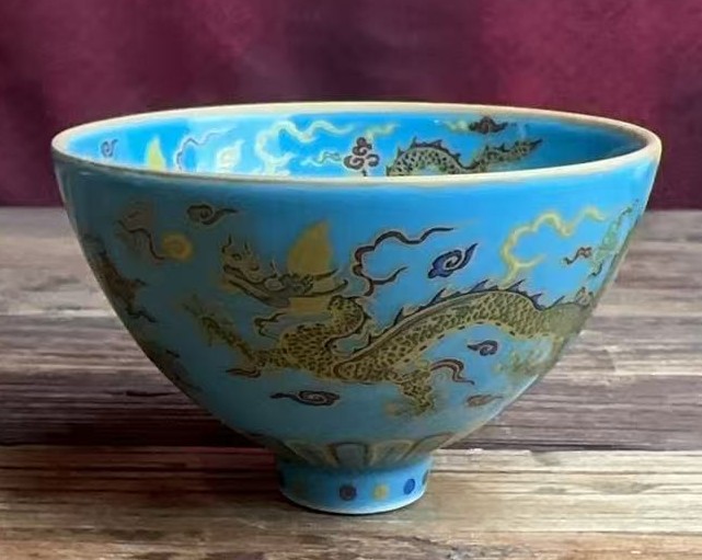 明宣德蓝釉珐琅彩龙纹鸡心杯