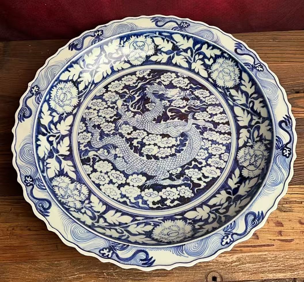 名称:白浒孤窑青花留白云龙纹折沿大盘