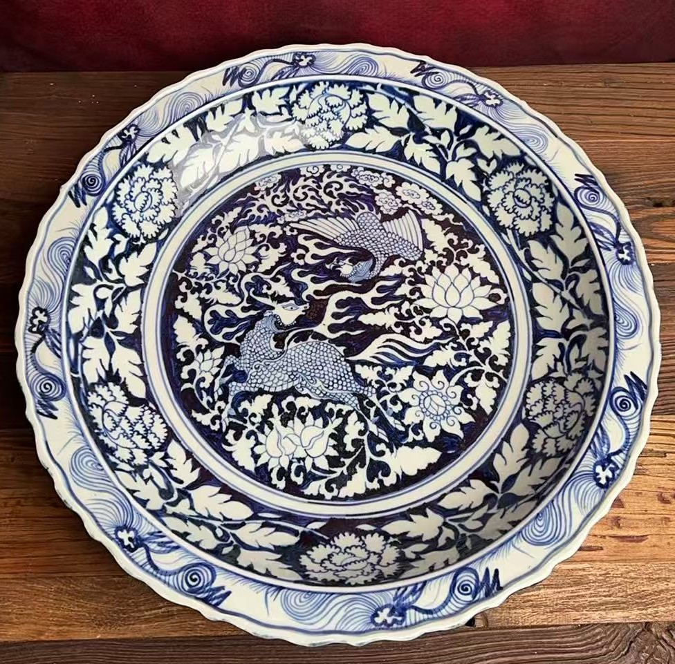 名称:白浒孤窑青花留白麟凤呈祥纹折沿大盘