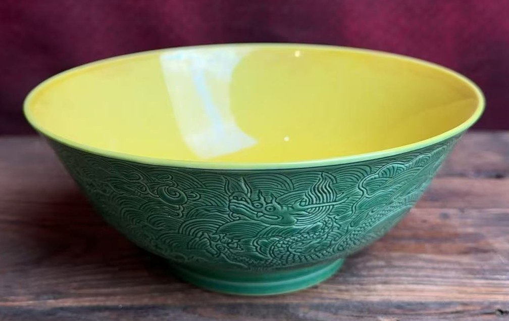 名称:明成化内黄釉外绿釉暗刻龙纹碗