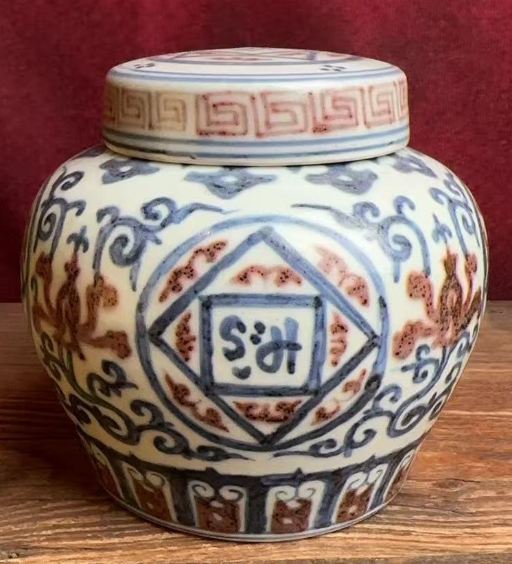 名称:明宣德青花釉里红梵纹盖罐