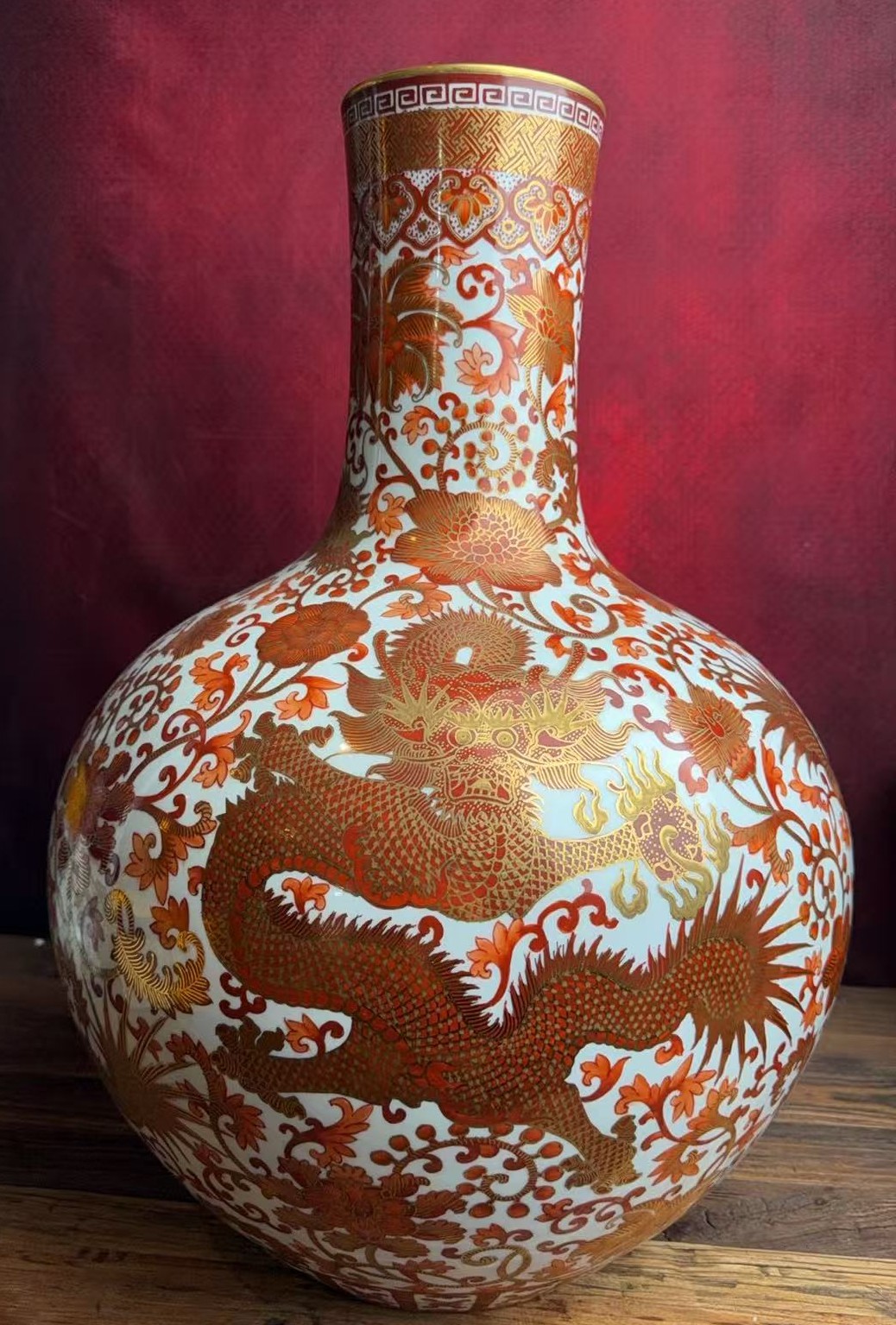 名称:清乾隆矾红描金龙穿缠枝莲纹天球瓶
