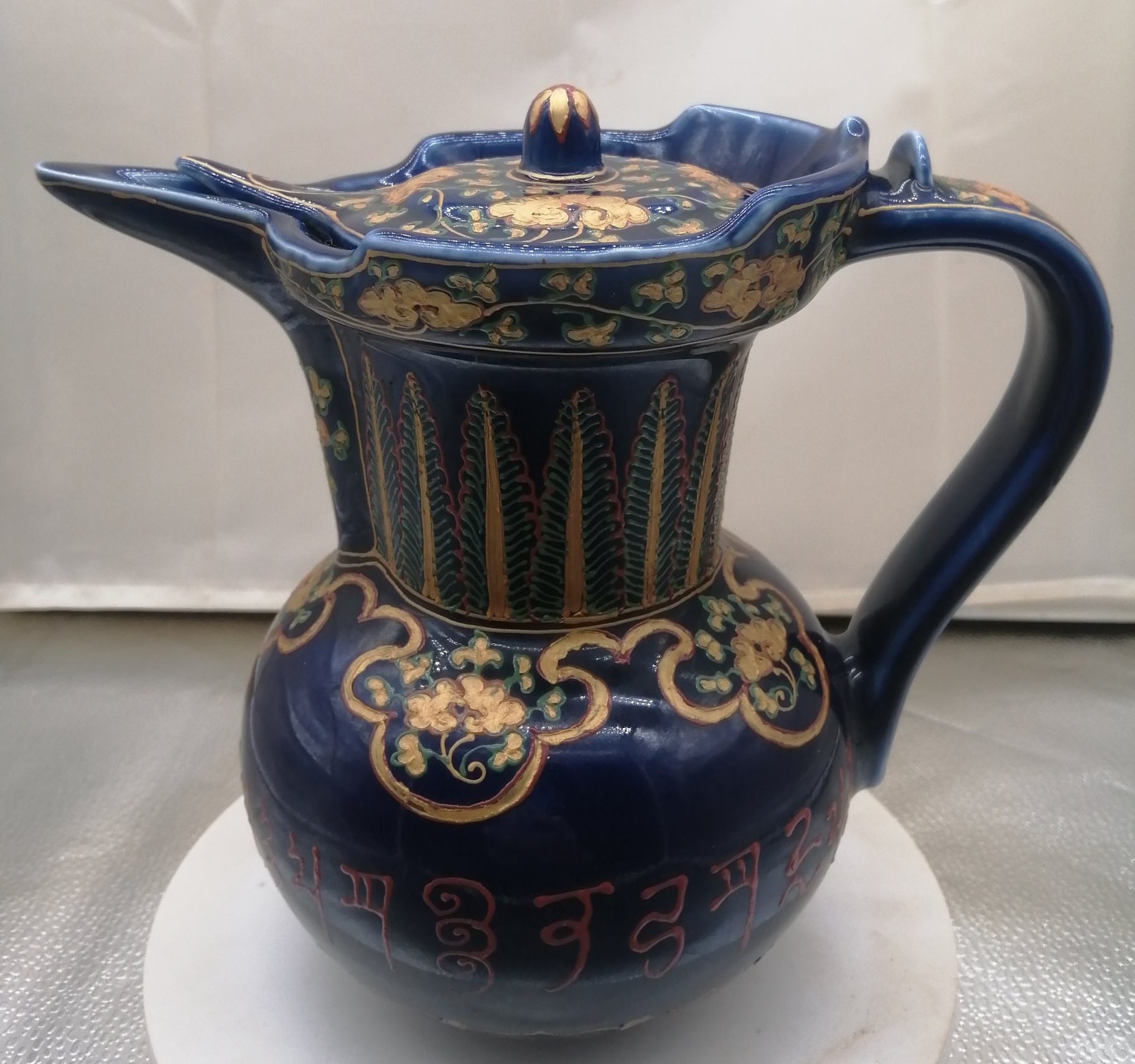 名称:明永乐霁蓝釉梵纹僧帽壶