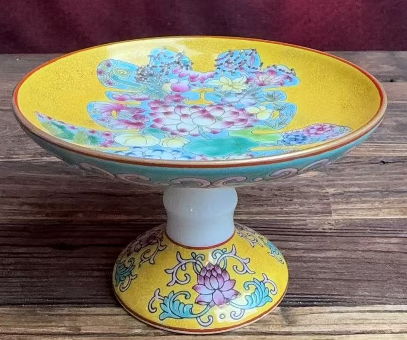 名称:清雍正黄地珐琅彩囍字纹高足盘