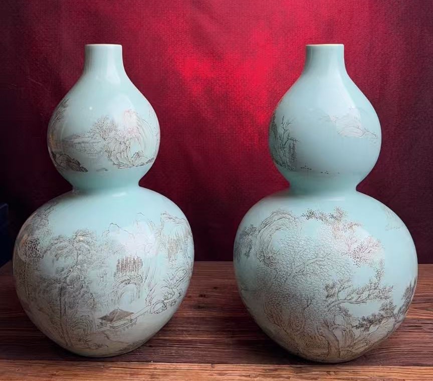 名称:清乾隆松石绿地墨彩山水纹葫芦瓶