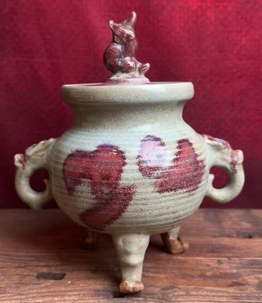 名称:钧窑天青釉紫斑三足熏炉