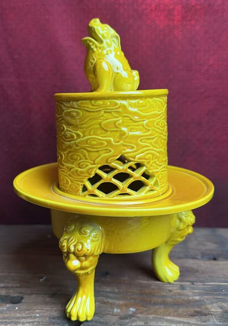 名称:清乾隆黄釉兽钮三足熏炉