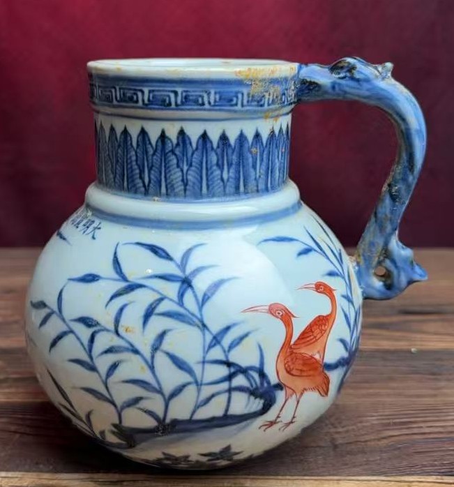 名称:明宣德青花矾红花鸟纹花浇
