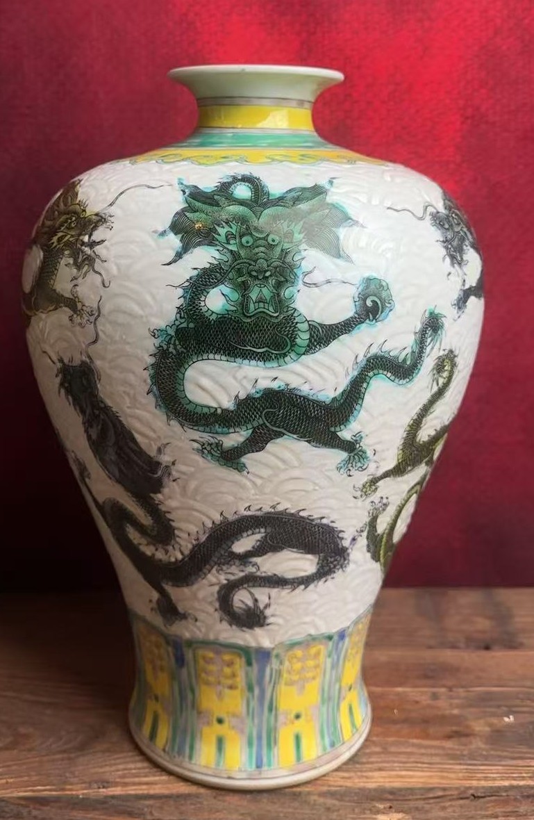 名称:清康熙五彩浮雕海水龙纹梅瓶
