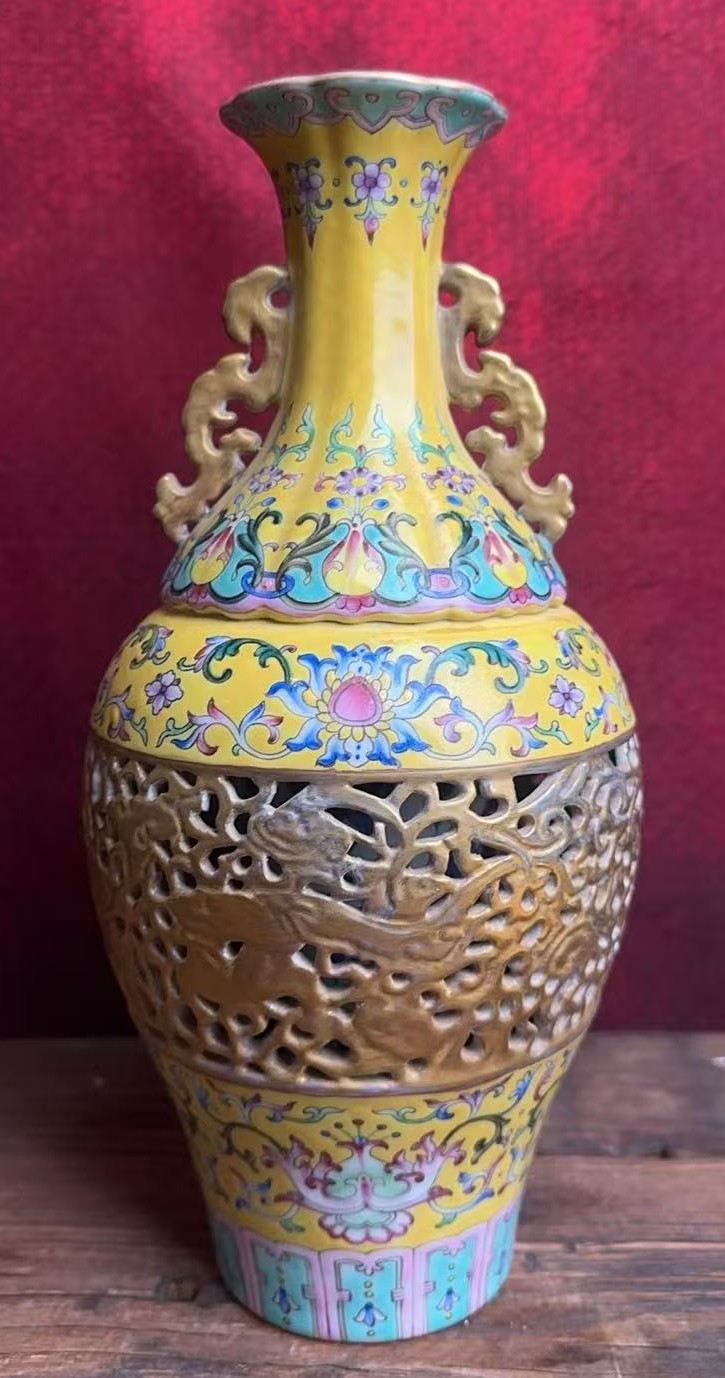 名称:清雍正黄地珐琅彩描金镂雕花卉纹双耳瓶