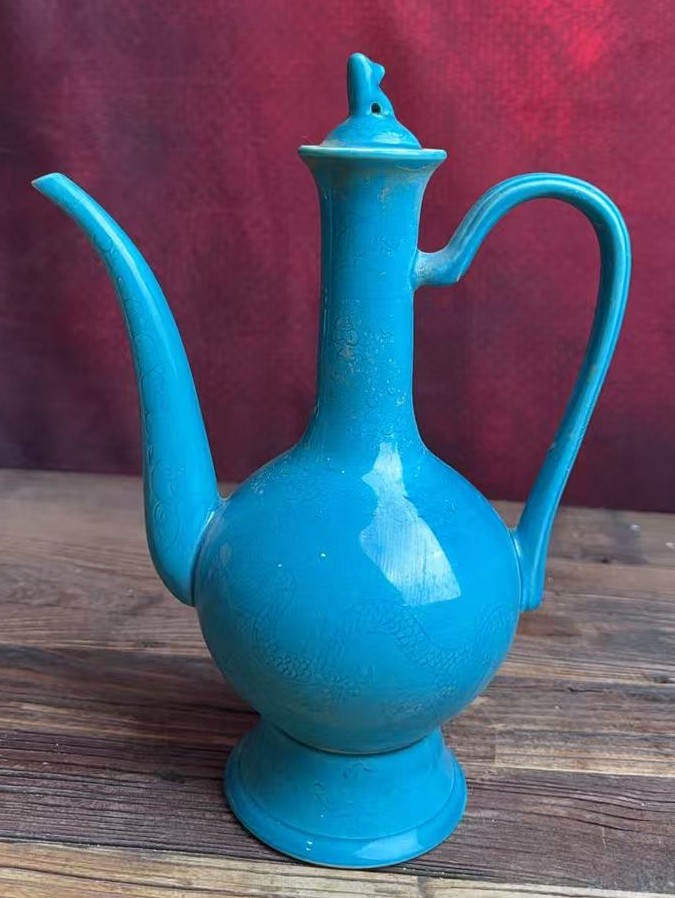 名称:明成化孔雀蓝釉暗刻龙纹执壶