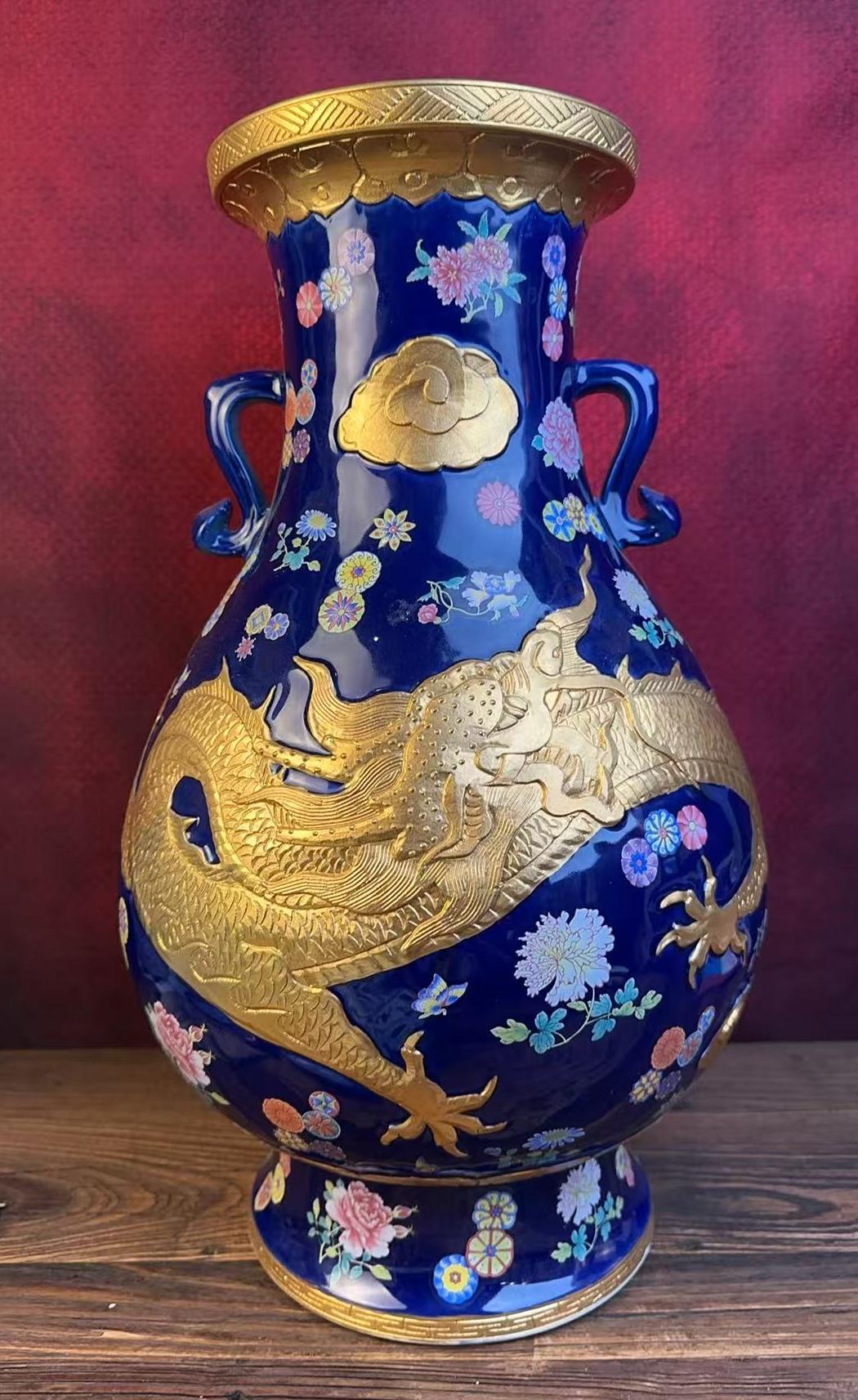 清乾隆洋彩描金浮雕龙纹双耳尊