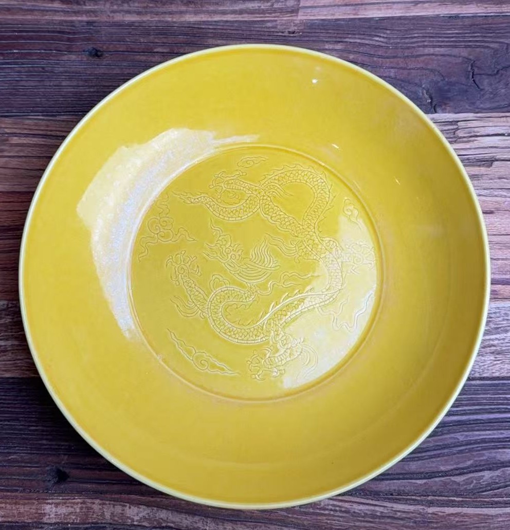 明成化黄釉暗刻龙纹盘