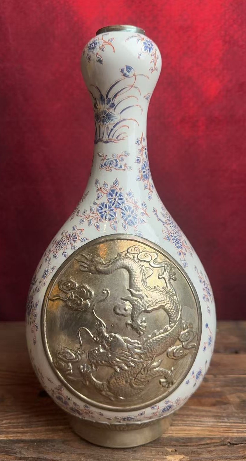名称:清乾隆珐琅彩镶银浮雕龙凤纹蒜头瓶