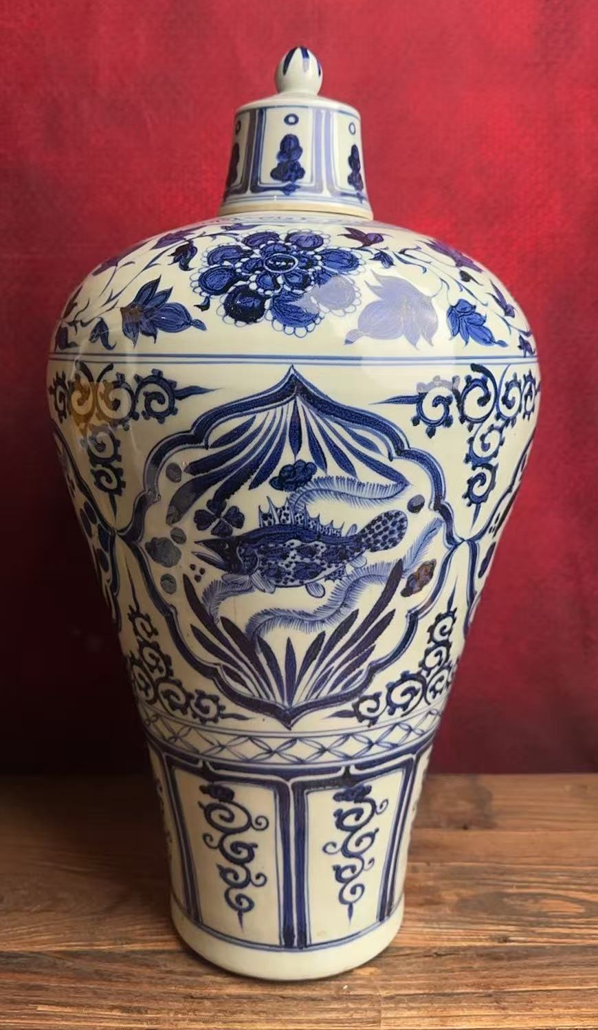 名称:元青花开窗鱼藻纹梅瓶
