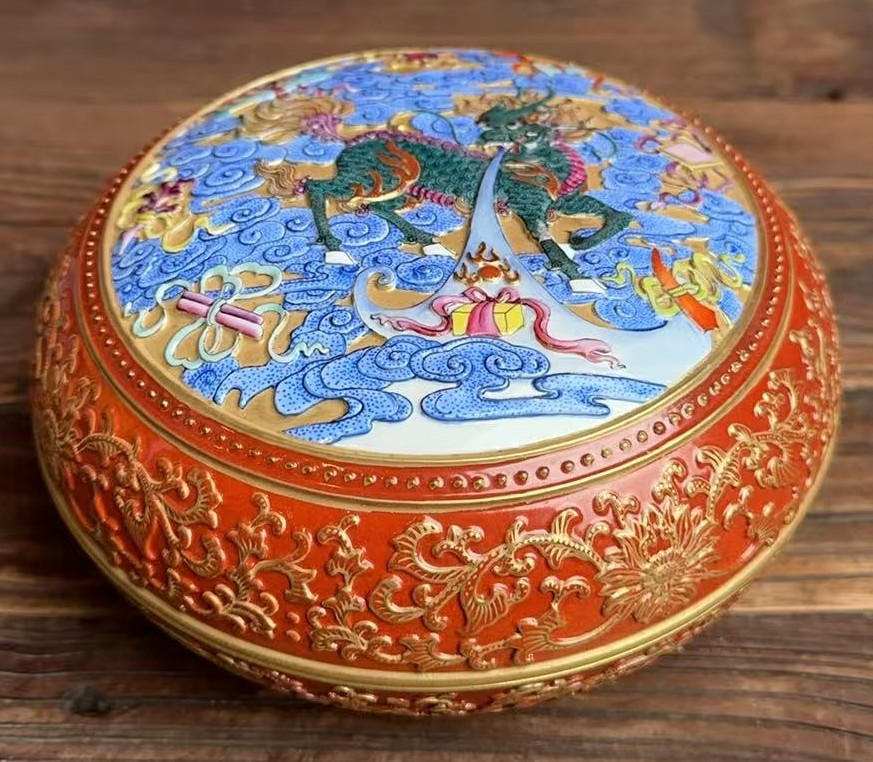 名称:清乾隆仿漆釉描金浮雕麒麟杂宝纹盖盒