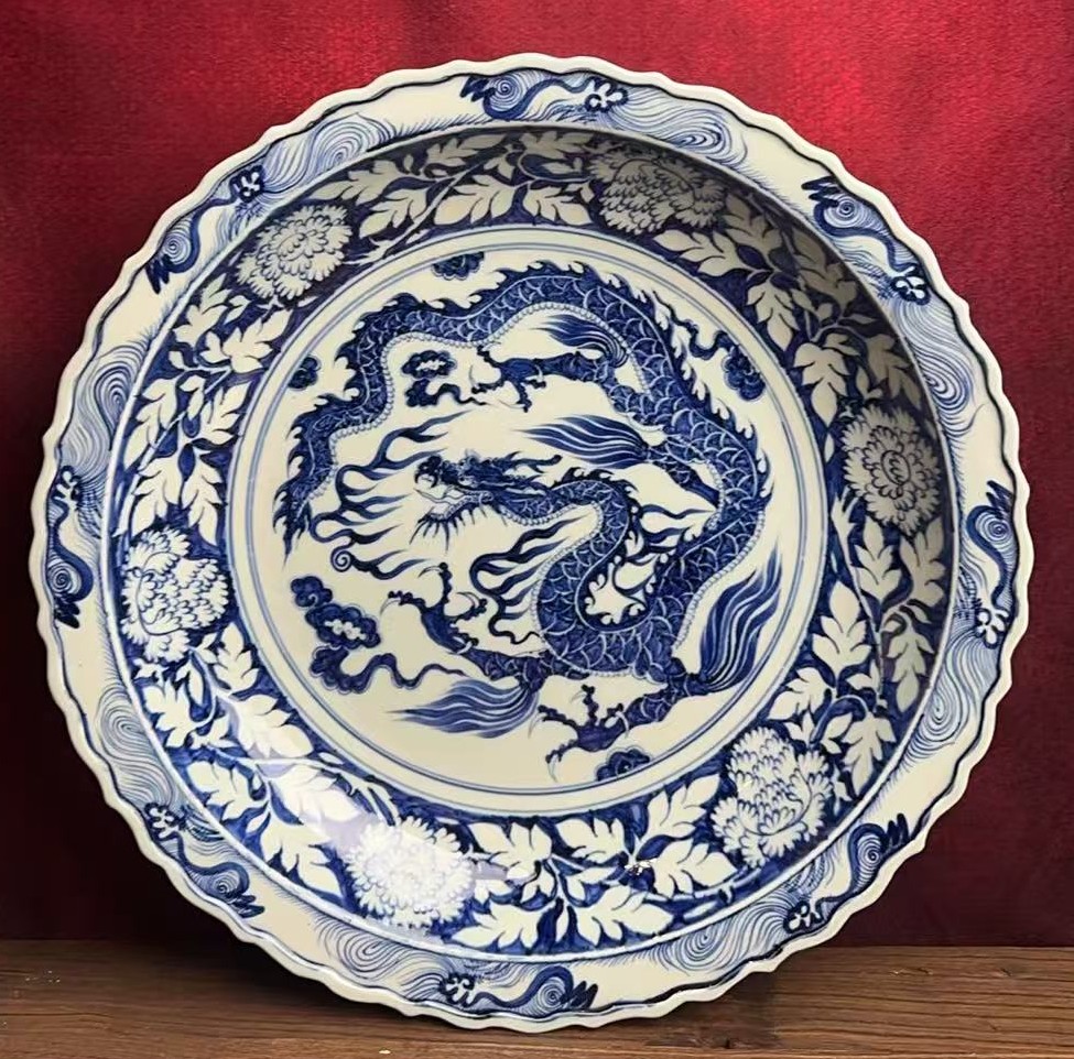 名称:白浒孤窑青花留白开窗龙纹花口盘