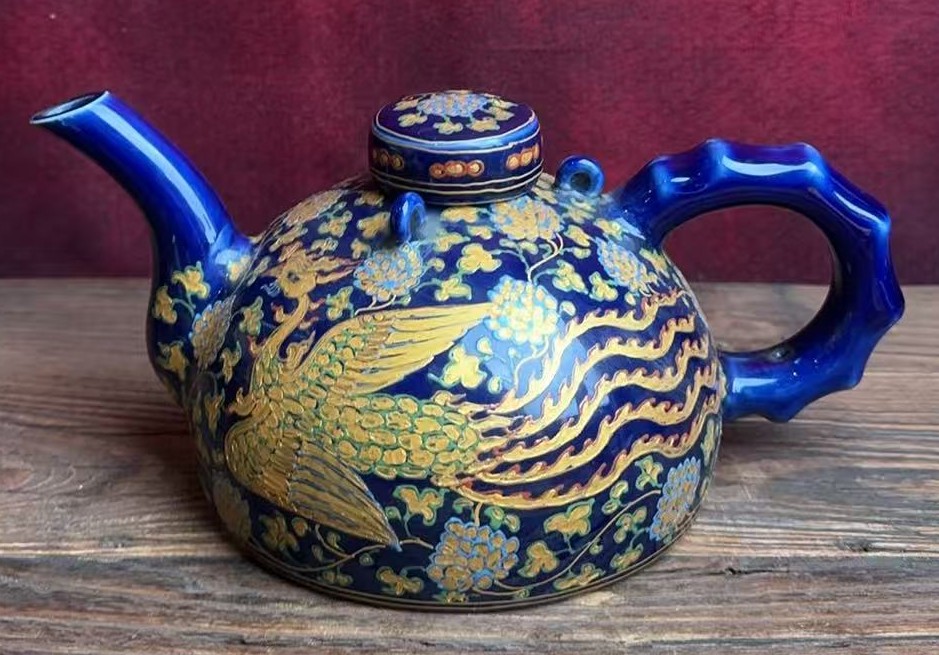名称:明永乐霁蓝釉沥粉戗金凤穿花纹执壶