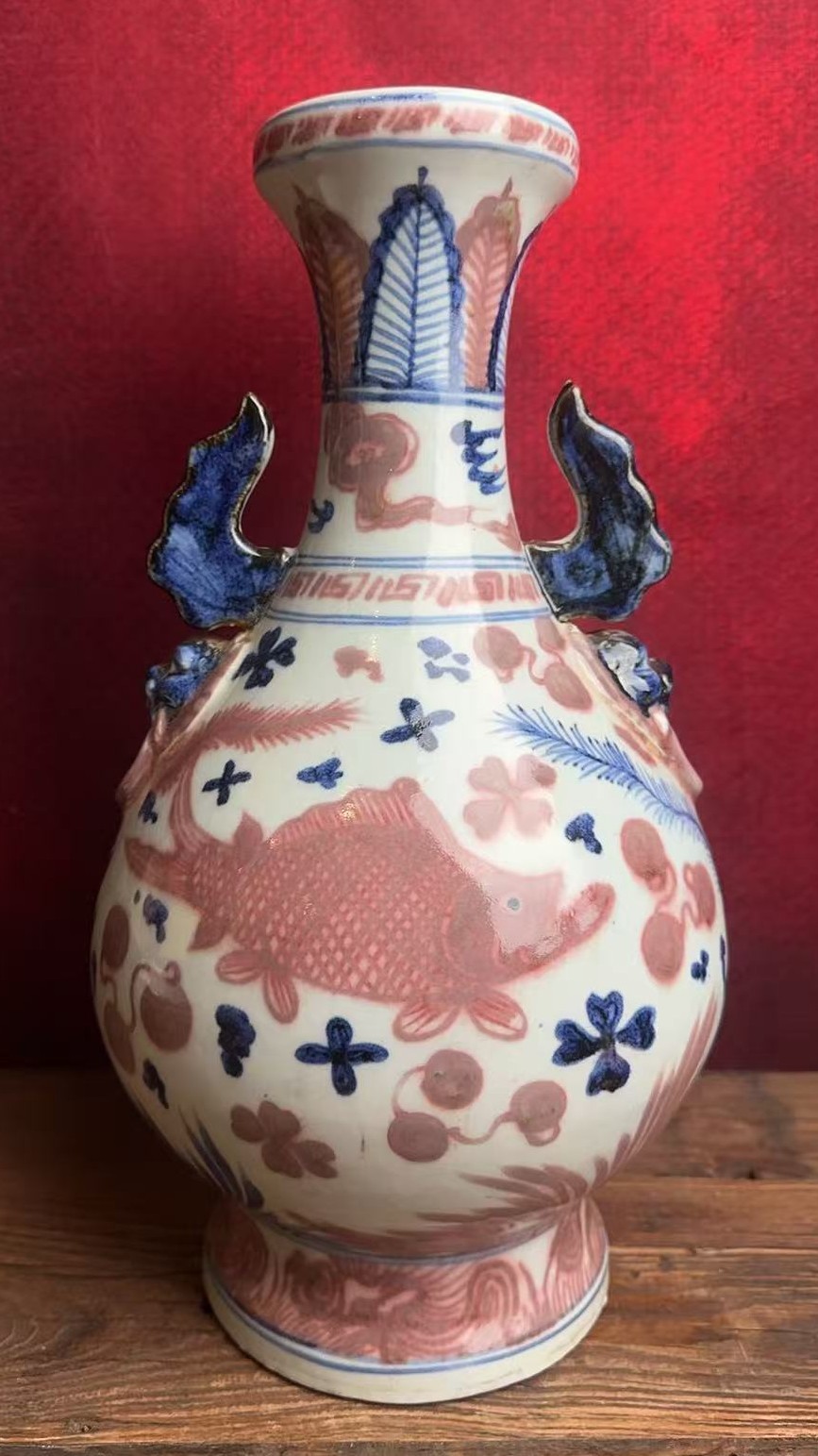 名称:元青花釉里红鱼藻纹双耳盘口瓶