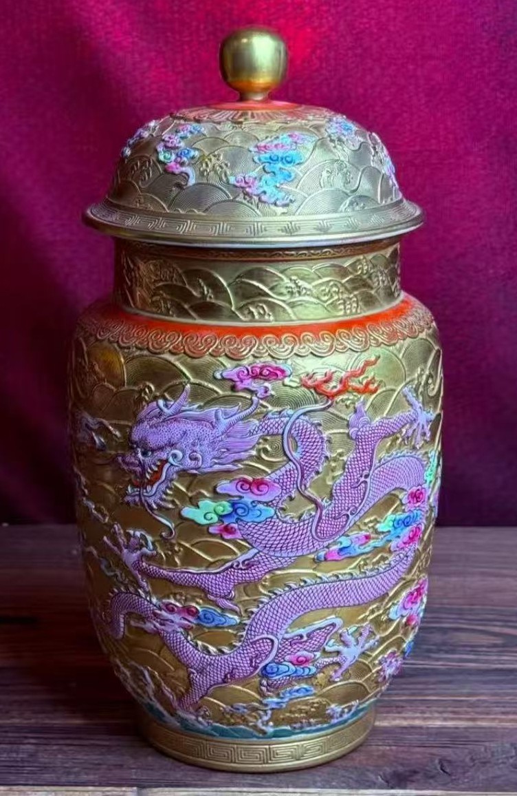 名称:清乾隆珐琅彩描金浮雕海水龙纹盖罐