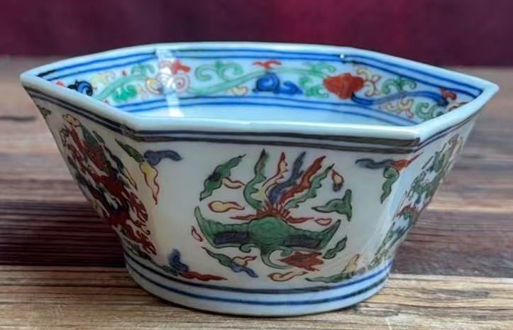 名称:明嘉靖青花五彩龙凤纹六方洗