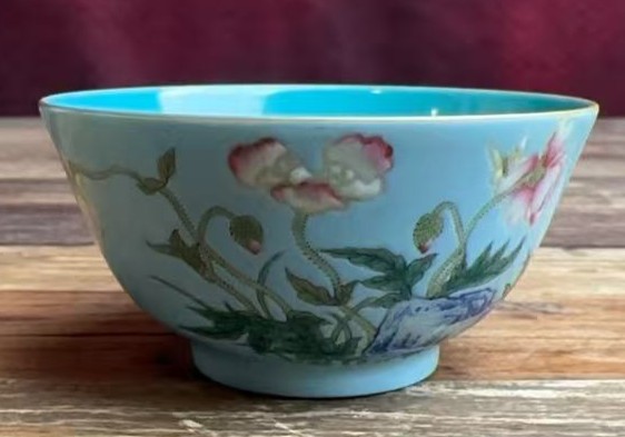 名称:清康熙松石绿釉轧道珐琅彩花卉纹杯