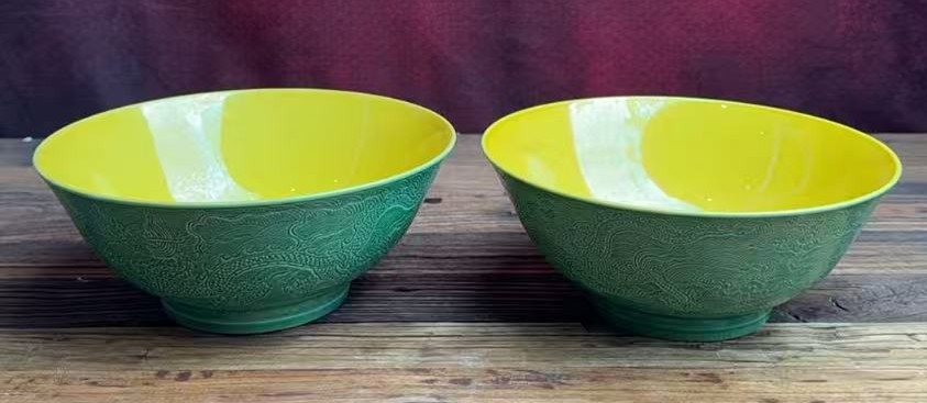 名称:明成化内黄釉外绿釉暗刻龙纹碗