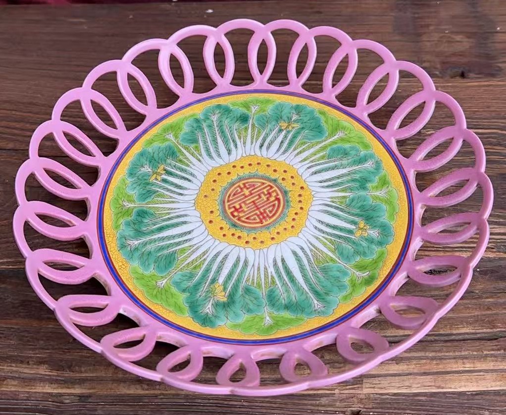 名称:清雍正珐琅彩百财寿字纹镂雕花边果盘