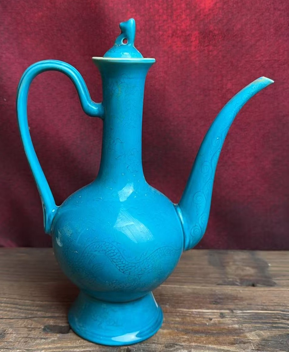 名称:明成化孔雀蓝釉暗刻龙纹执壶