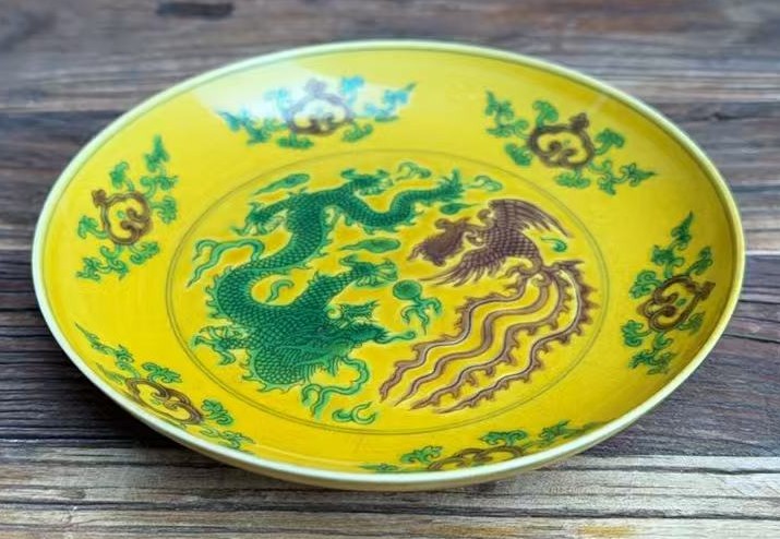 清宣统黄地素三彩龙凤纹盘