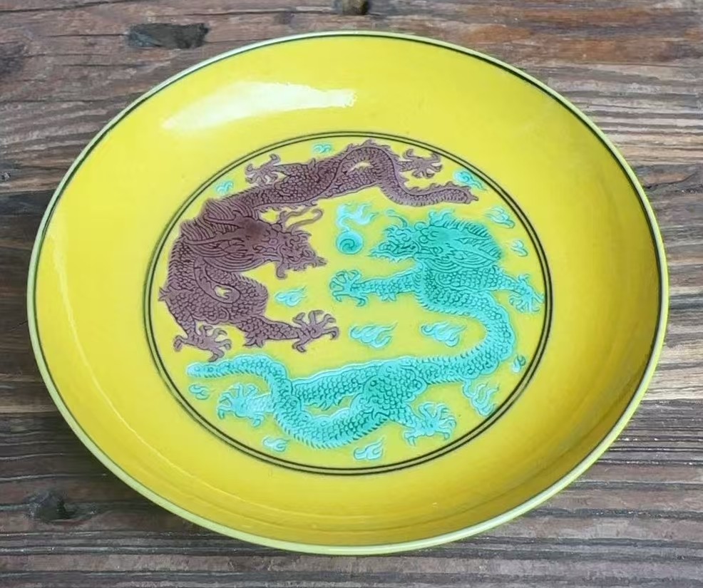 清嘉庆黄地素三彩双龙盘