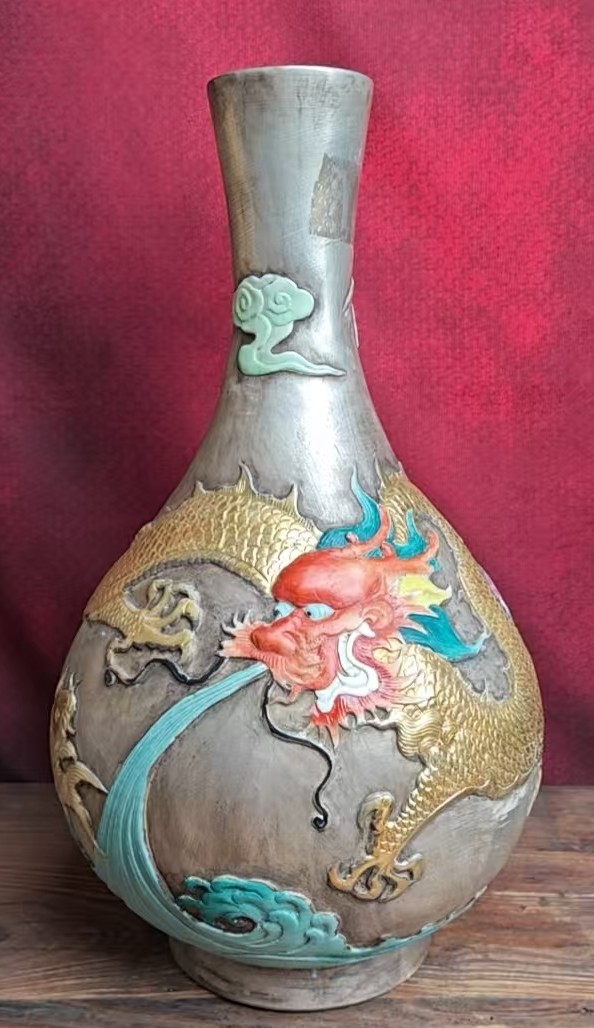 名称:清雍正粉彩描银浮雕龙纹长颈瓶