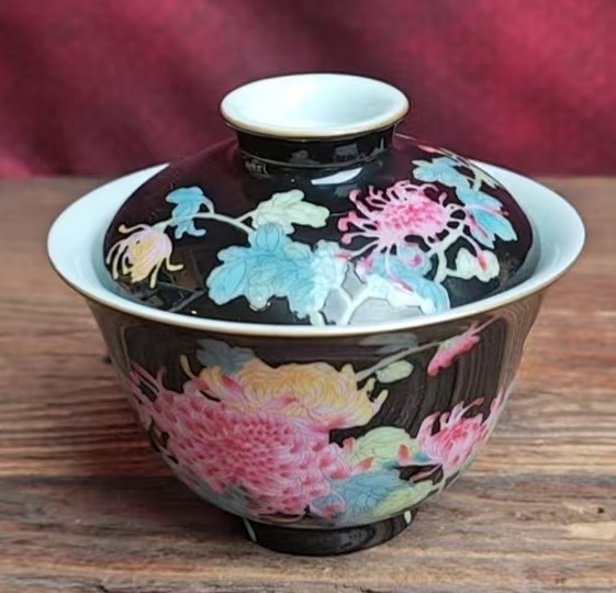 名称:清雍正墨地珐琅彩花卉纹盖碗